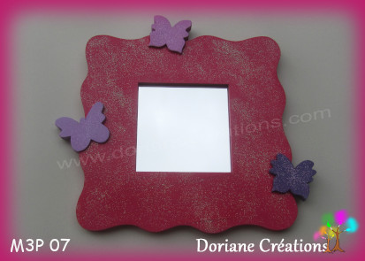 Miroir framboise avec décor papillons tons violets en relief, paillettes sur l'ensemble