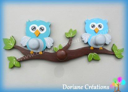Porte manteau, porte robe de chambre. Décor chouettes garçon. 3 patères